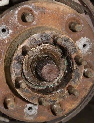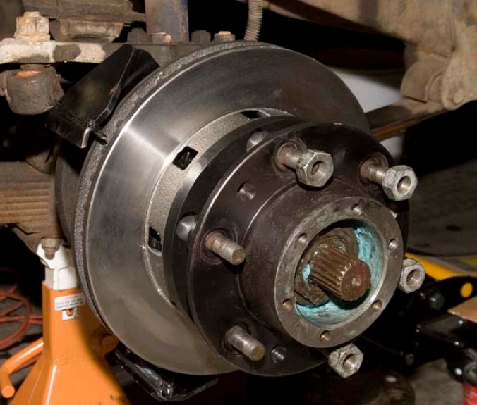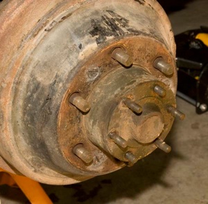 Take your new modified hub and remove the rotor from the hub. Press your old studs into the modified hub. You will need to press the studs ALL THE WAY in so that they rest squarely on the back surface of the hub. If you see any space between the back of the hub and the “head” of the stud, it is not seated all the way in and the wheel will be difficult or impossible to mount.