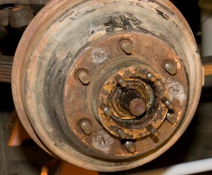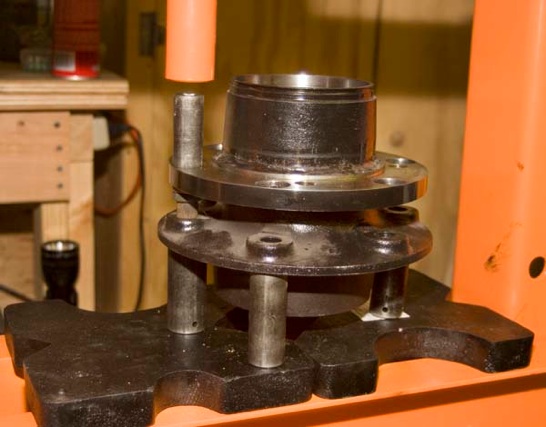 You will now need to press out your old wheel studs from your old hub. You can do this with a hydraulic press or stick a lug nut on the end of the stud and pound it out with a hammer like I did.