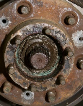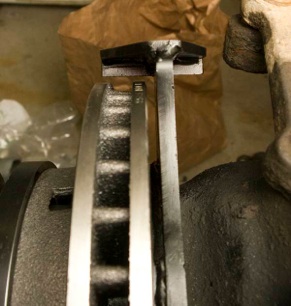 With the rotor securely mounted to your hub, grease and insert your inner bearing into the back side of the hub. Drive the inner grease seal into the hub which captures your inner bearing. Throw some more grease into the bearing cavity. You don’t want to have to pull of the hub again for a long time! Put some grease on your spindle and carefully slide the hub onto the spindle. The inner bearing is sort of just flopping around in there and it may take several tries to get it to slide correctly onto the spindle. It’s a close tolerance fit.