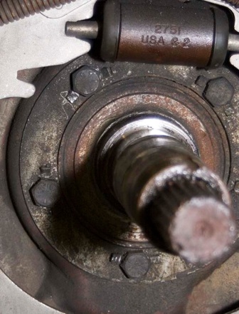 Then I removed the nuts holding the hub shackle attachment point. Pry off the drive flange (manual says to use a rawhide hammer). I found that a flathead screwdriver and a small hammer works well. Once you have a small gap, prying with two screwdrivers on opposite sides will persuade the flange to come off evenly without binding on the studs.