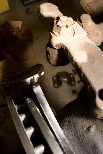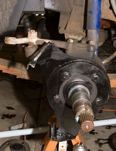 The spindle may or may not want to come loose. It can’t move too much, as the axle shaft sort of holds it up. Remove the drum brake plate and set it aside. Someone might want it, and the wheel cylinders and shoes are interchangeable with the rears.