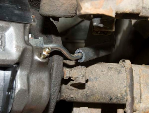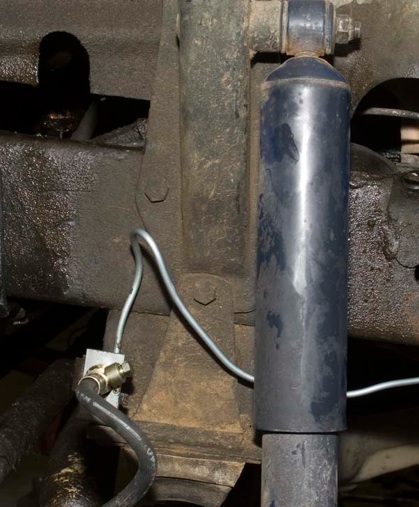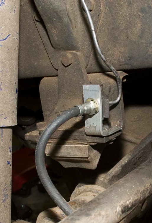 Ray had suggested running the hoses to hard lines mounted on the axle and then connecting the hard line to just one flexible hose, similar to the setup used on the rear axle. Ray stated that this would allow for more articulation of the front axle without stressing the brake hoses.